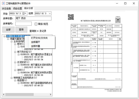 采用标题搜索“地下 防水”,共计6条,列表可以根据右键,全部展开或收起,标题所搜,可以多个关键词用空格隔开,没有顺序要求,只搜索表单标题,不包含表单目录,搜索结果如下图所示: